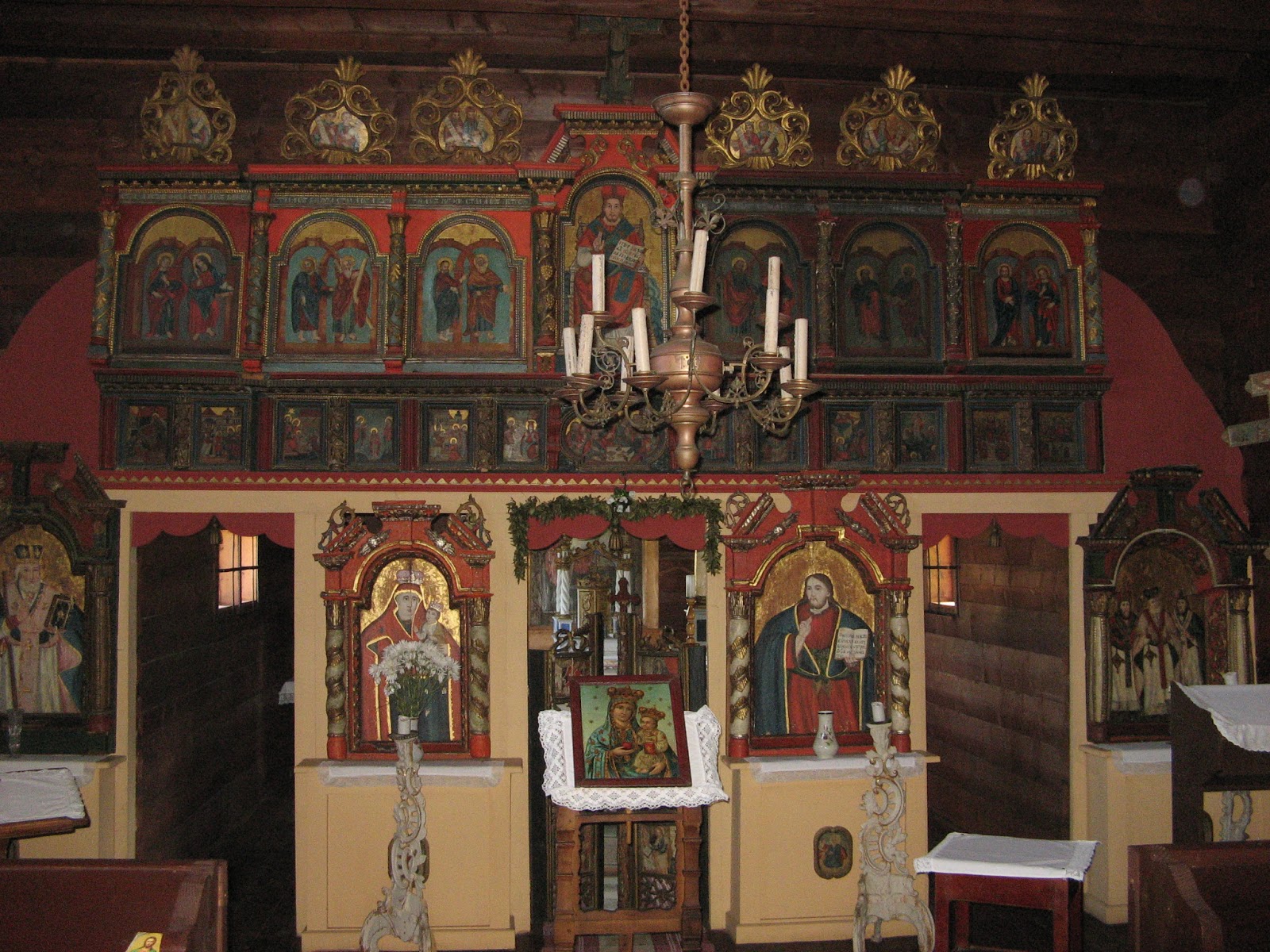 The wooden walls of the interior of the original church in Nová Polianka were covered in paintings of scenes from the Bible, but these were not recreated for the church in the museum. The iconostasis dates from the early 18th century and came from a church in a nearby village. There is a royal door at the centre of the iconostasis but the deacon doors for the two side entrances into the sanctuary are missing.